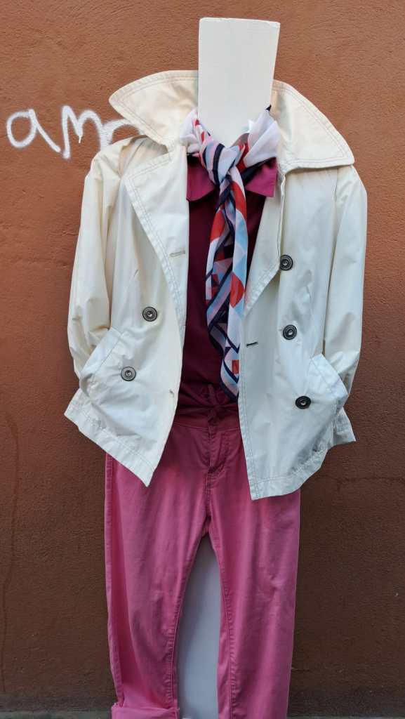Conjunto de chaqueta blanca, pantalón y otros complementos para mujer. En muy buen estado. A la venta juntos o por separado en la próxima edición de Ganbarazelai.