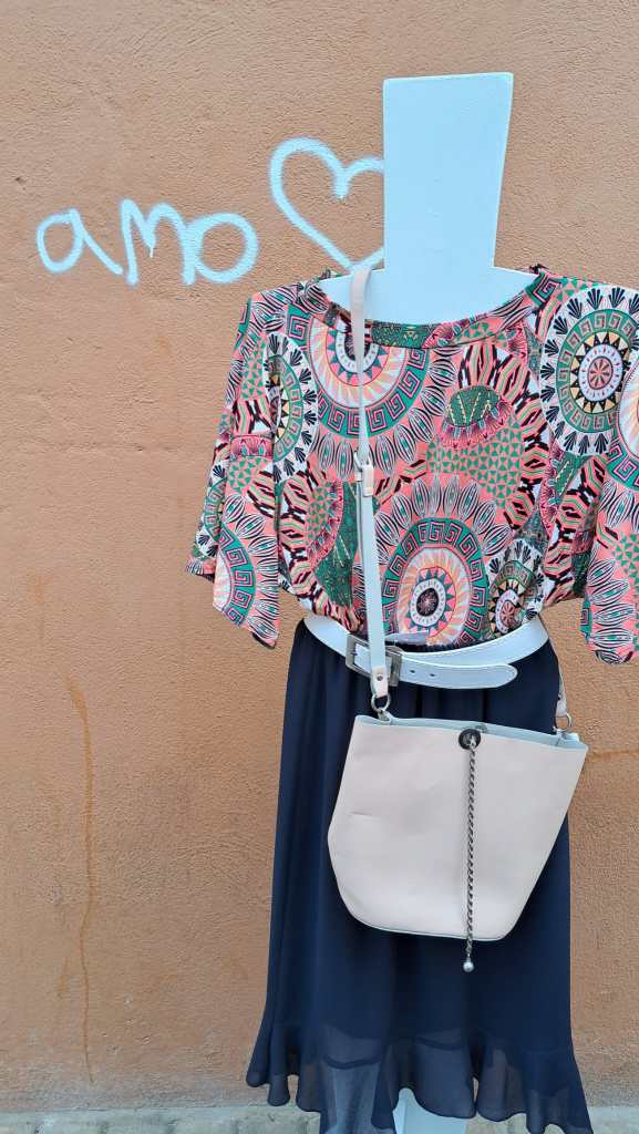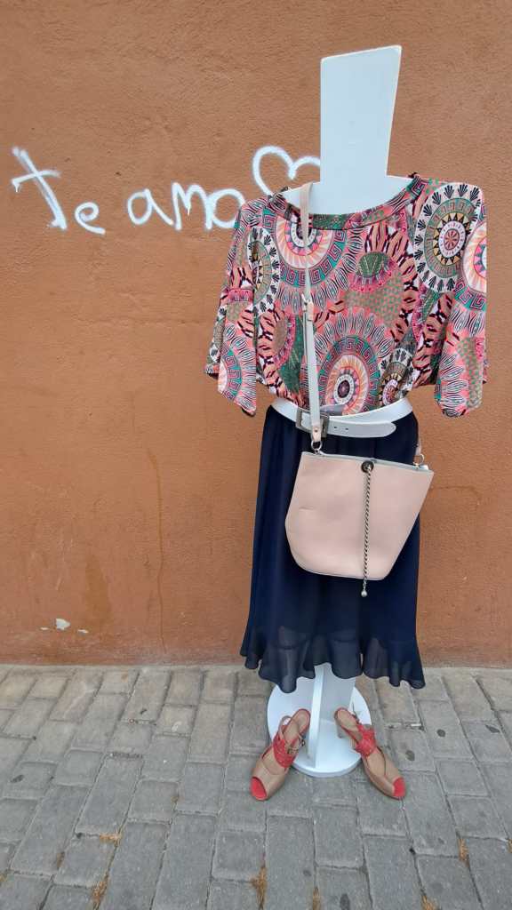 Conjunto de señora compuesto de falda negra, blusa estampada, sandalias, bolso, cinturón y collar. En muy buen estado. A la venta juntos o por separado en la próxima edición de Ganbarazelai.