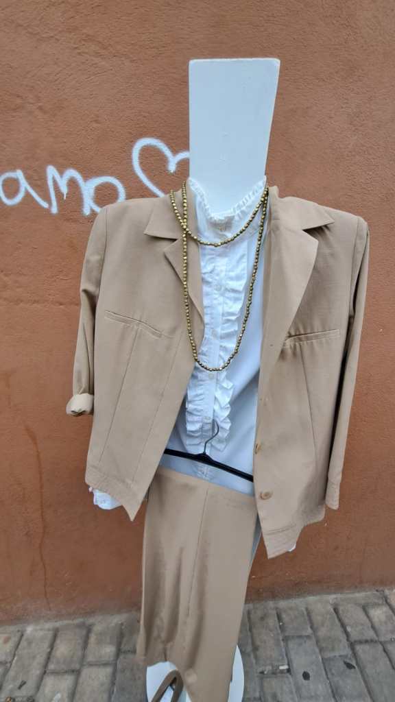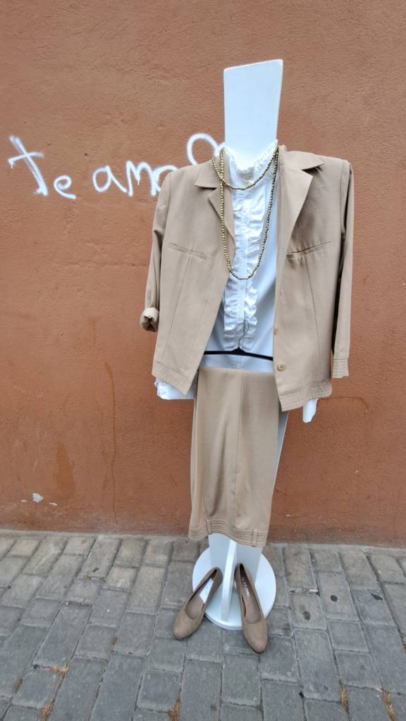 Traje de señora en muy buen estado. Conjuntado con blusa blanca, zapatos y collar. A la venta juntos o por separado en la próxima edición de Ganbarazelai.