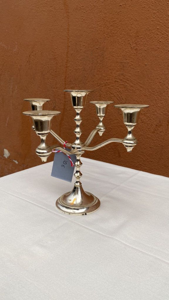 Candelabro de metal con acabado plateado. Nuevo, sin utilizar, en perfecto estado y listo para utilizar. A la venta el domingo 1 de septiembre en la próxima edición de Ganbarazelai. Precio: 10€.