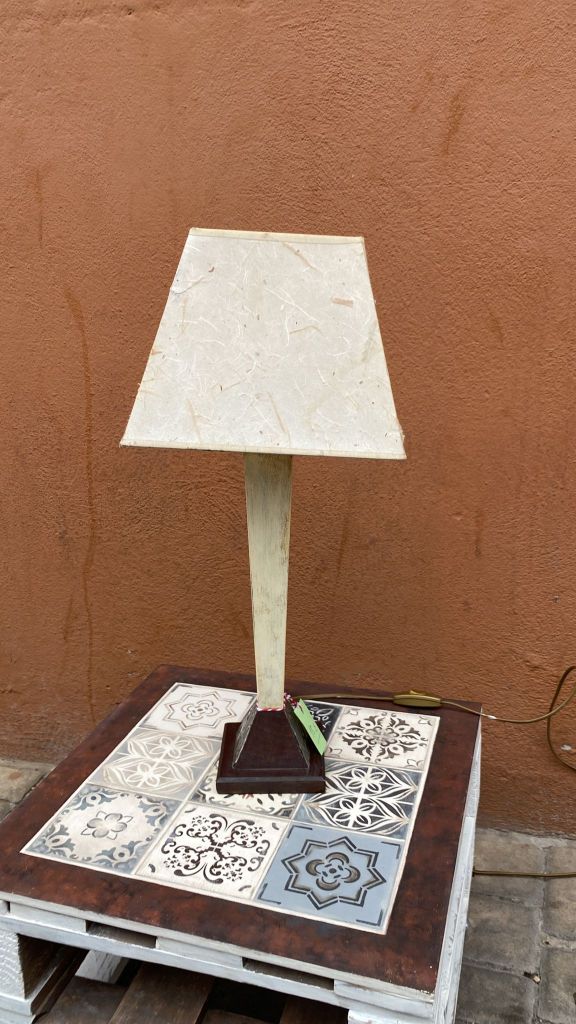 Lampara para mesilla. Pie en madera y tulipa translúcida. Restaurada por una artesana. En perfecto estado y lista para utilizar. A la venta el domingo 1 de septiembre en la próxima edición de Ganbarazelai. Precio: 15€.