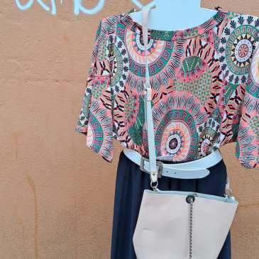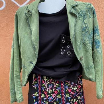 Conjunto formado por chaqueta verde, camiseta, falda estampada y sandalias de mujer. En muy buen estado. A la venta juntos o por separado, en el próximo Ganbarazelai, el 1 de septiembre de 2024. Precios:– Chaqueta 6€– Camiseta 3€– Falda 5€– Sandalias 3€
